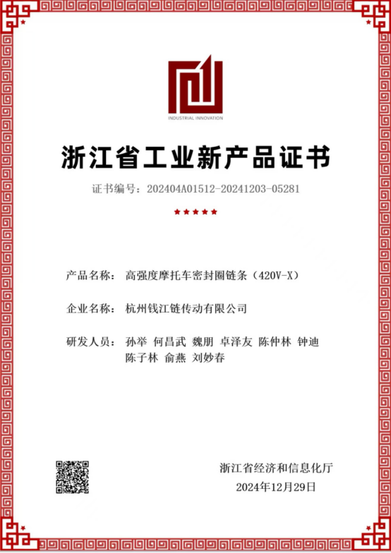 Model Rantai Tertutup Oli Sepeda Motor Berkekuatan Tinggi 420V-O(X) Dikembangkan dan Diproduksi oleh Hangzhou Qianjiang Chain Industries Co., Ltd. Lulus Sertifikasi Produk Baru Tingkat Provinsi