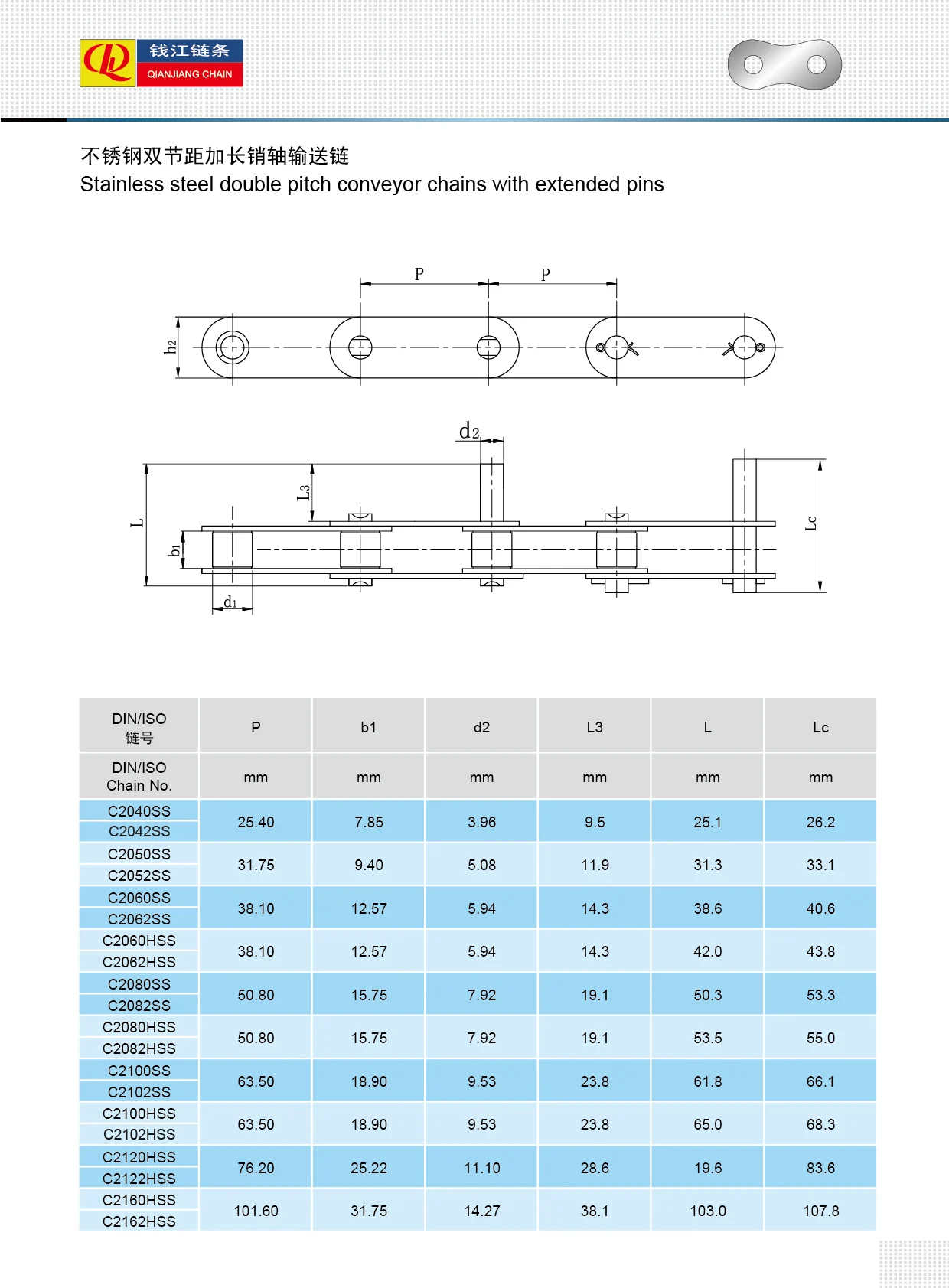 Rantai konveyor pitch ganda baja tahan karat dengan pin yang diperpanjang
